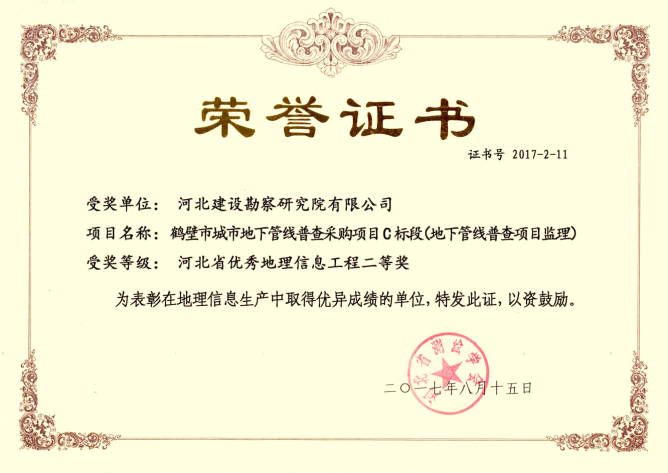 近日,經河北省測繪學會評選,由我公司承擔的鶴壁市城市地下管線普查采購項目C標段(地下管線普查項目監理)榮獲河北省優秀地理信息工程二等獎。