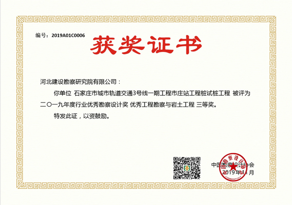 根據(jù)中國勘察設(shè)計(jì)協(xié)會(huì)下發(fā)的文件《關(guān)于公布2019年度工程勘察、建筑設(shè)計(jì)行業(yè)和市政公用工程優(yōu)秀勘察設(shè)計(jì)獎(jiǎng)評(píng)選結(jié)果的通知 》(中設(shè)協(xié)字[2019]136號(hào)),經(jīng)專家評(píng)審、中國勘察設(shè)計(jì)協(xié)會(huì)網(wǎng)站公示和中國勘察設(shè)計(jì)協(xié)會(huì)獎(jiǎng)勵(lì)委員會(huì)審定,公司申報(bào)的項(xiàng)目“浙江舟山液化天然氣(LNG)接收及加注站項(xiàng)目一期工程LNG儲(chǔ)罐設(shè)施巖土工程勘察與樁基工程”榮獲2019年度國家行業(yè)優(yōu)秀勘察設(shè)計(jì)獎(jiǎng)一等獎(jiǎng)、“石家莊市城市軌道交通3號(hào)線一期工程市莊站工程樁試樁工程”榮獲該獎(jiǎng)項(xiàng)三等獎(jiǎng)。此次獲獎(jiǎng)必將激勵(lì)我公司專業(yè)技術(shù)人員繼續(xù)發(fā)揚(yáng)刻苦創(chuàng)新精神,用心做出精品工程,為公司增光添彩!