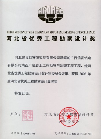廣西信發鋁電有限公司靖西廠址巖土工程勘察與治理工程獲河北省優秀工程勘察設計一等獎。